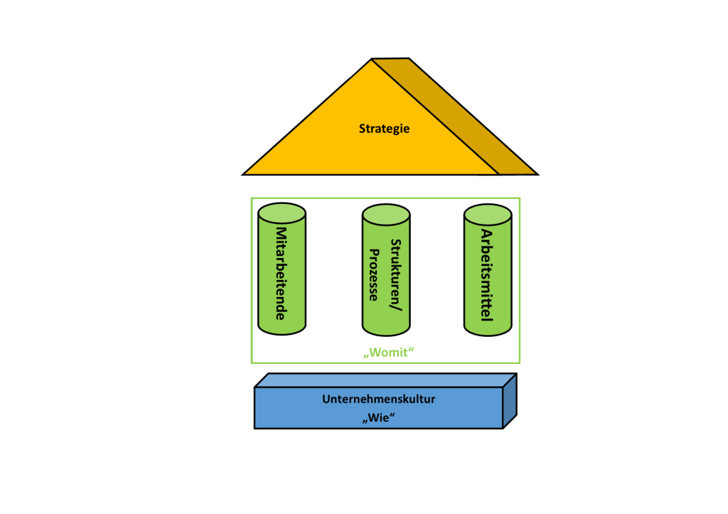 Aus dem bisher Gesagten, ergibt sich eine Art „Organisationshaus“ mit der Strategie, entstanden aus dem eigentlichen Zweck der Organisation, als Dach, das über allem ragt, mit Menschen, Strukturen/Prozesse und Arbeitsmitteln als tragende Säulen und der Unternehmenskultur als Fundament, auf dem alles ruht: